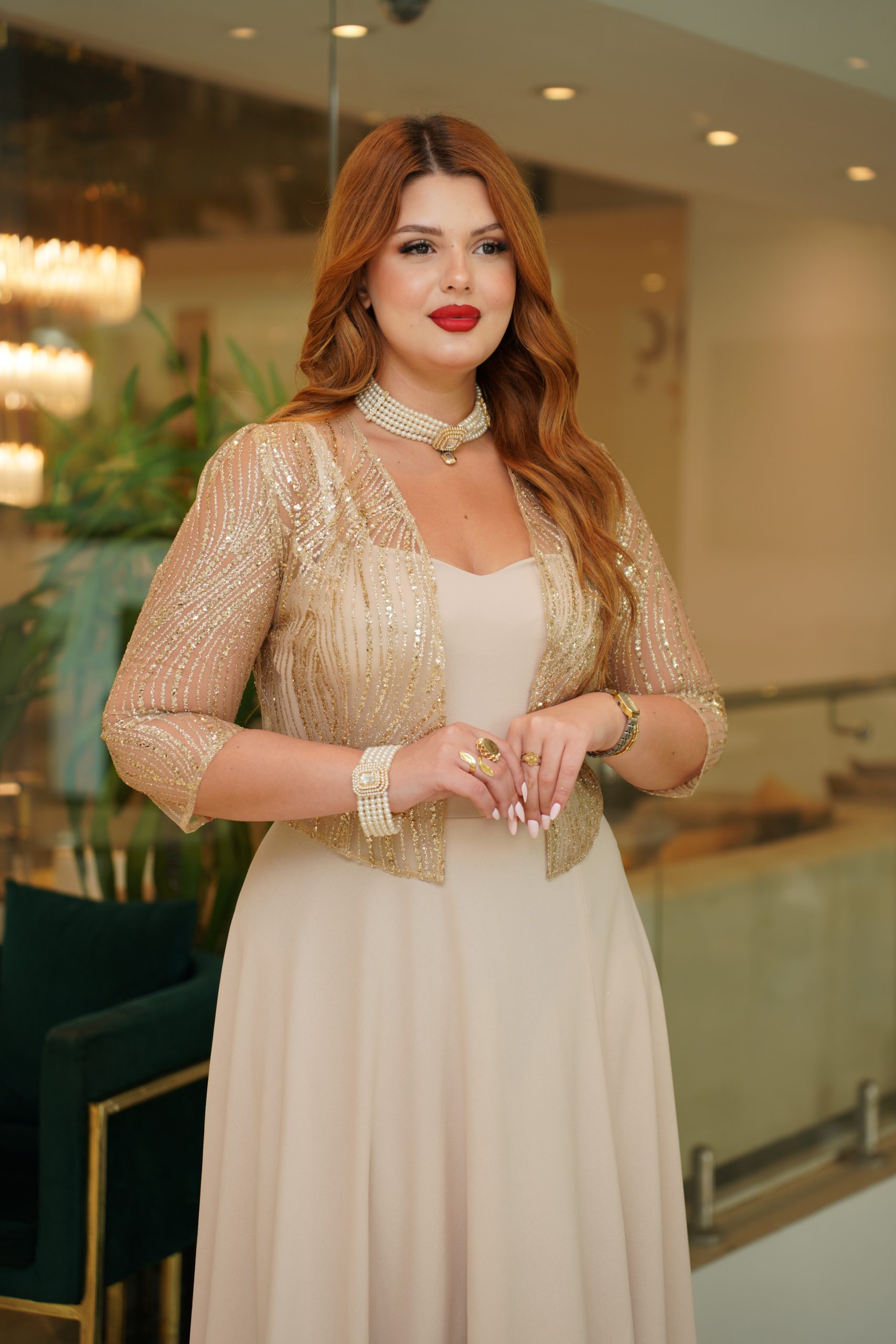 Une robe de soirée à bretelles (tissu scoba) accompagnée d’un gilet en caviar pailleté.